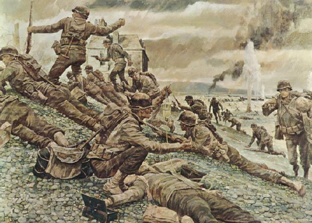 Behind them was a great invasion armada and the powerful sinews of war. But in the first wave of assault troops of the 29th (Blue and Gray) Infantry Division, it was four rifle companies landing on a hostile shore at H-hour, D-Day -- 6:30 a.m., on June 6, 1944. The long-awaited liberation of France was underway. After long months in England, National Guardsmen from Virginia, Maryland and the District of Columbia found themselves in the vanguard of the Allied attack. In those early hours on the fire-swept beach the 116th Infantry Combat Team, the old Stonewall Brigade of Virginia, clawed its way through Les Moulins draw toward its objective, Vierville-sur-Mer. It was during the movement from Les Moulins that the battered but gallant 2d Battalion broke loose from the beach, clambered over the embankment, and a small party, led by the battalion commander, fought its way to a farmhouse which became its first Command post in France. The 116th suffered more than 800 casualties this day -- a day which will long be remembered as the beginning of the Allies' "Great Crusade" to rekindle the lamp of liberty and freedom on the continent of Europe.